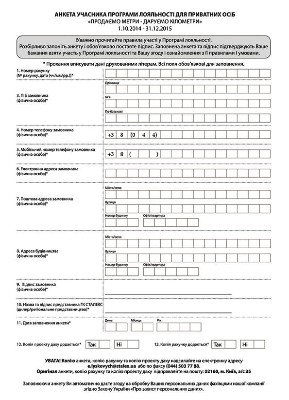 7.2. В період дії Програми лояльності, Учаснику-покупцю продукції ТОВ «СТАЛЕКС ПРОФІ» пропонується заповнити Анкету Учасника з метою подальшої реєстрації такого Покупця як Учасника Програми лояльності.
